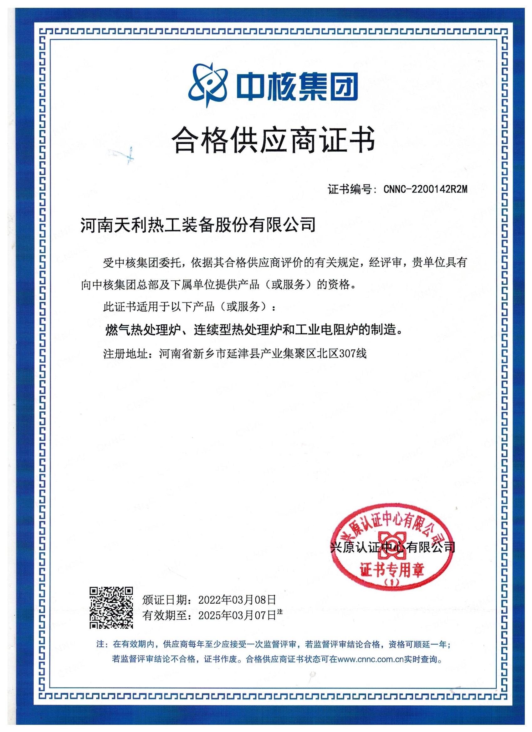 中核集團合格供應商證書